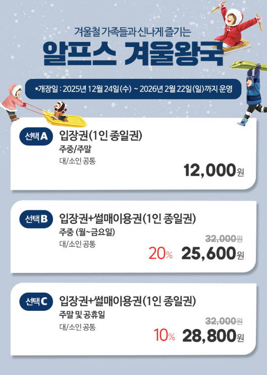 현장 상황(기온, 얼음 상태)에 따라 변동될 수 있어, 방문 전 공식 공지 확인이 안전합니다. 매표는 보통 마감 1시간 전에 종료됩니다. - https://www.alpsvill.com/71 대표홈페이지 주소 남겨요!